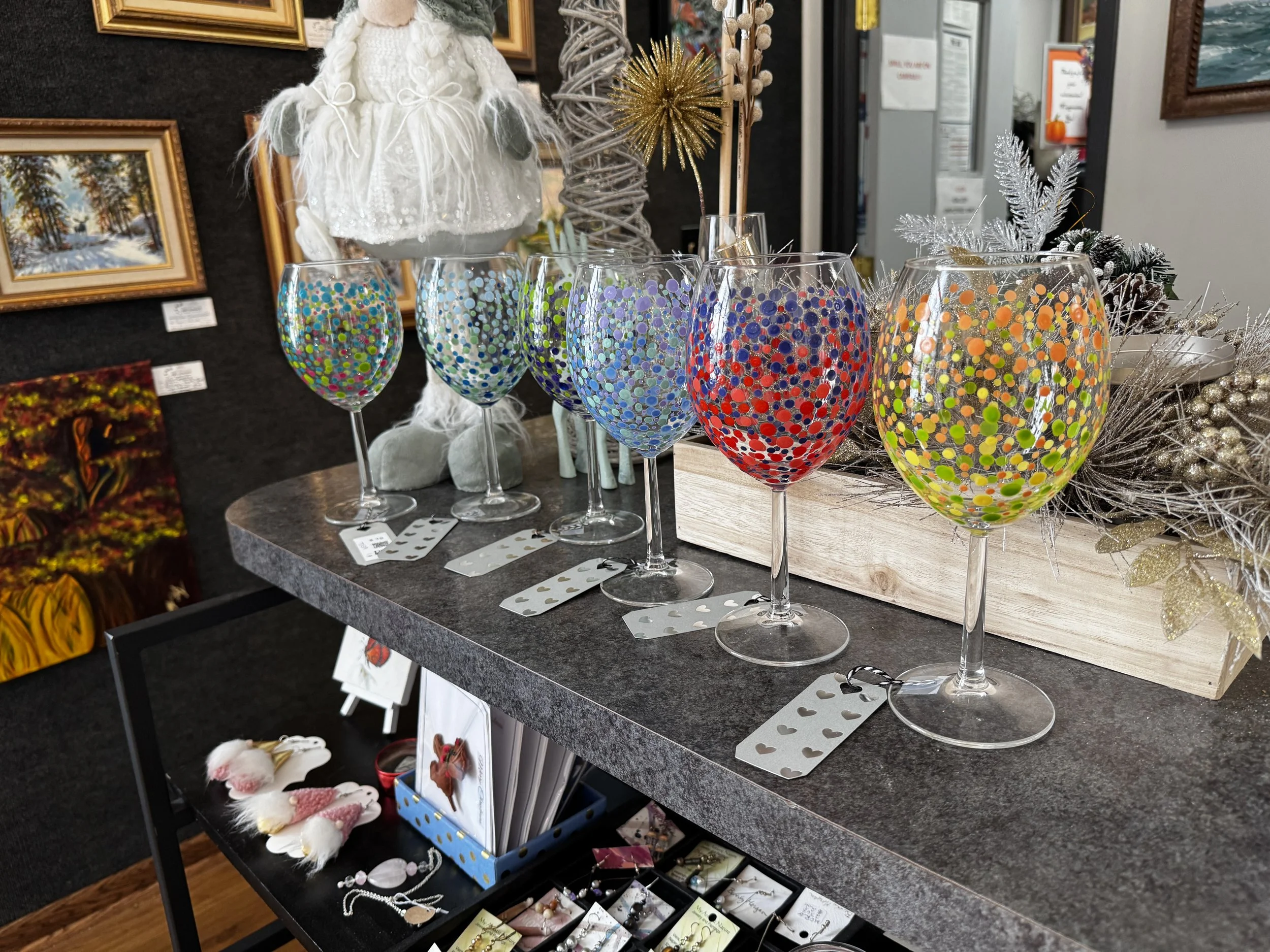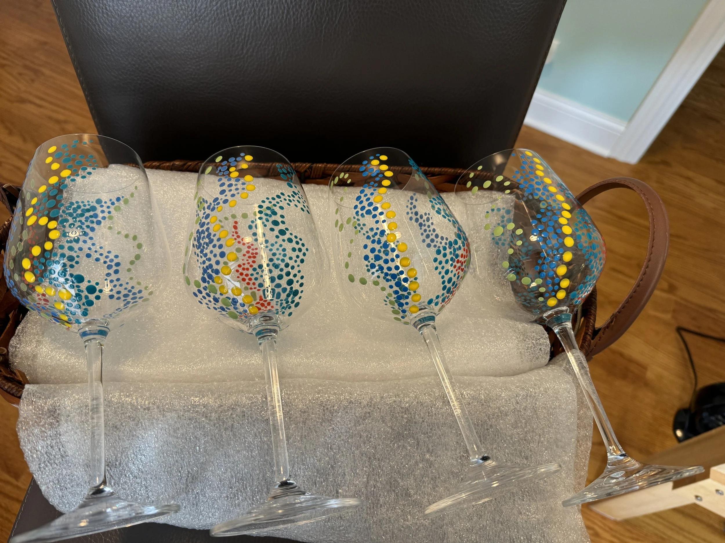 It began in the late 1990s with the idea of creating a “take-away” wine glass for clients attending quarterly presentations at the radio station where I worked. My daughter painted musical notes on the first glasses, and soon I began painting, too. I gravitated toward dots rather than notes—and Dots Crazy was born.
